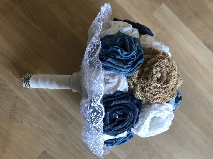 Il y a 1359 joursVoici mon bouquet entièrement réalisé à la main, thème blue Jeans & blanc Denim ( les strass terminent le bouquet et rappel les paillettes du tulle de la robe, les perles blanches figurent également sur mon bustier, ma robe est blanche et ma...
