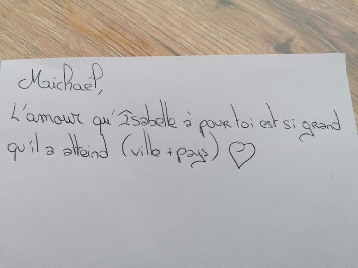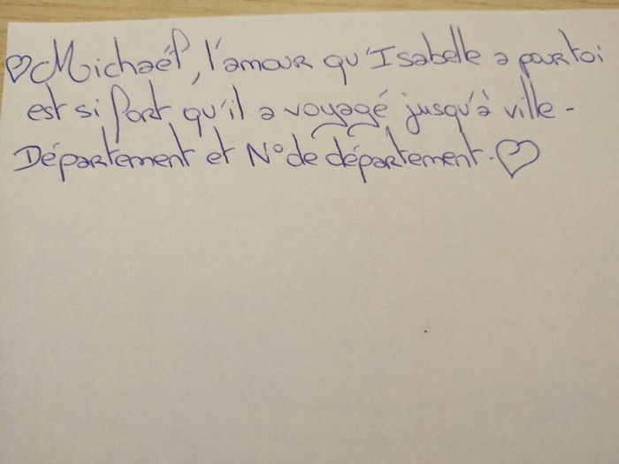 Bonjour, j'ai eu l'idée de faire un love note pour mon compagnon. Je trouve ça vraiment génial Si vous pouviez participer à votre manière sa serai sympa 😃 Voici la phrase >> Julien, l'amour que te porte Olivia est si fort qu'il a voyagé...