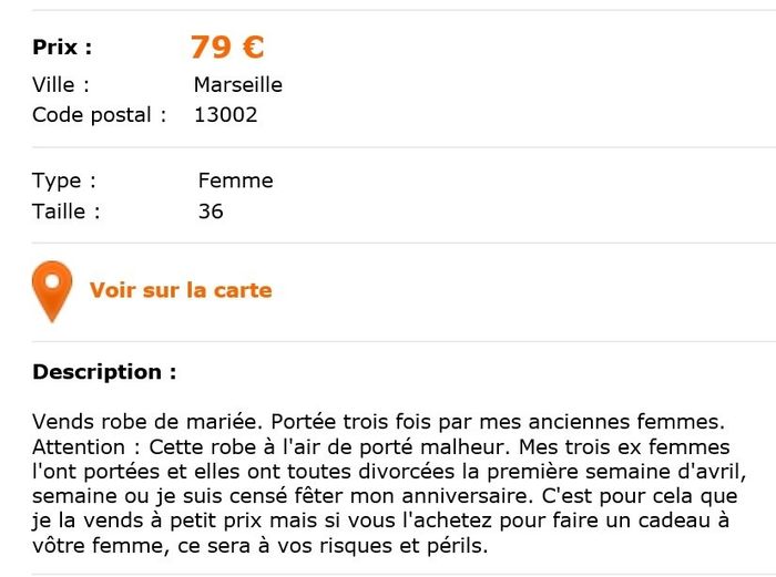 Les filles, regardez sur quoi je suis tombée! Voulant mettre ma robe de mariée en vente, je consultais les annonces des "concurrentes", quand je suis tombée sur cette annnonce. Vraiment très étrange mais j'ai bien ri. Qu'en pensez-vous?