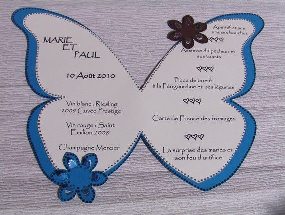 coucou les filles, je souhaiterai savoir si l'une d'entre vous sait si on peux faire soi meme des menus en forme de papillon. Je m'explique je souhaiterai avoir la forme du papillon pour y inscrir le menu à l'intérieur (je l'écrirai moi meme ou a...