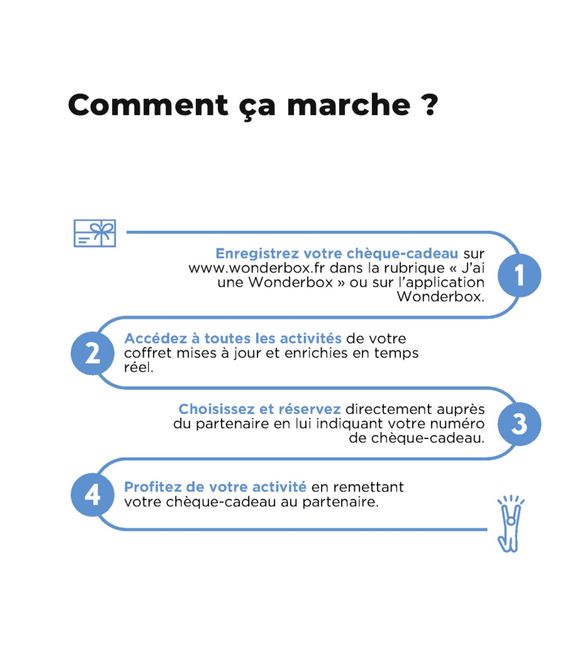 Hello les filles Une amie nous a offert un cadeau Wonderbox pour notre mariage. Sauf que on ne sais pas l’utiliser… on comprends rien! On va sur le site mais on tombe que sur 2/3 choix qui se court après. Par exemple dans le cadeau nous avons 2h30/3h...