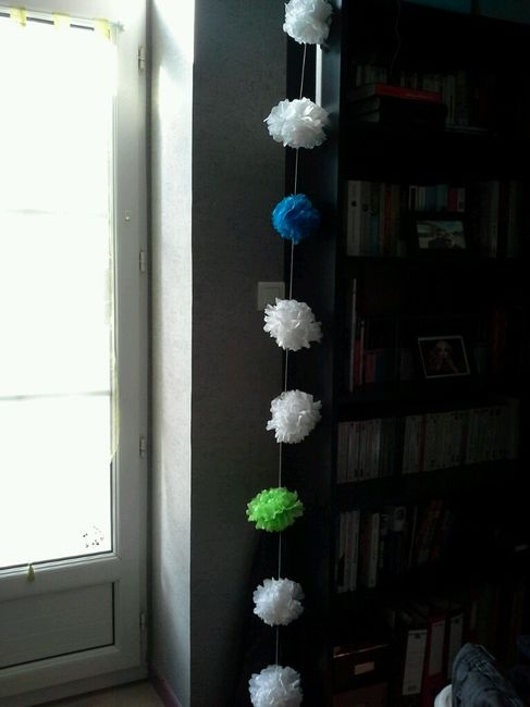 Apres avoir longuement réfléchi et calculé, j'ai trouvé comment décorer les fameux buts dans ma salle : un rideau de pompons !! Si mes calculs sont bons, j'ai 24 "longueurs" à faire pour que cela soit assez fourni. J'hésite encore entre entourer les...