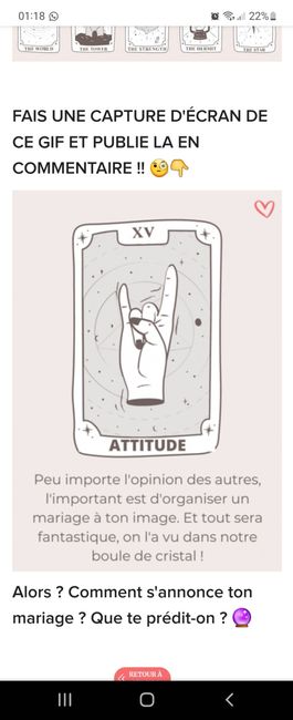 Coucou tout le monde 💜 Merci d'avoir participé jusqu'au bout ! Maintenant qu'on en sait un peu plus sur ton mariage, on va pouvoir tirer les cartes... FAIS UNE CAPTURE D'ÉCRAN DE CE GIF ET PUBLIE LA EN COMMENTAIRE !! 🧐👇 Alors ? Comment s'annonce ton...