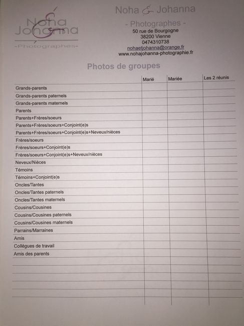 Cc a tous si vous vous êtes préparer une list pour organiser le passage de qui prend en photo? Pouvez vous partagez vos list j'ai l impression que j'oublie quelqu'un!!!