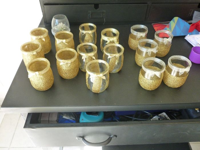 Coucou tout le monde Enfin mes 15 pots "Or" sont finis bon j'ai encore les argents à faire............ Il m'a fallu environ 5 jours (je suis pas rapide lol) mais entre la mise en place du scotch, le collage, les paillettes, le sechage, le...