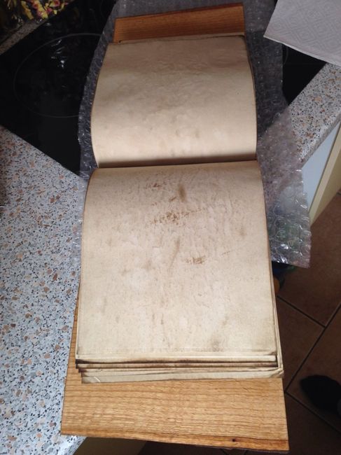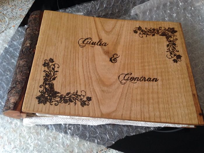 Voilà j'ai reçu aujourd'hui notre livre d'or fait entièrement de bois, de papier vieillit le tout relié par un cordon de cuir. La couverture est gravée dans le bois. Il est encore plus beau en vrai et sent bon le bois. Vous aimez ?