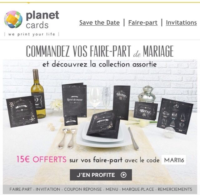 Hello les brides, Si cela peut vous interesser, voici un code promo que j'ai recu de Planet Cards pour toute la papeterie : MAR116
