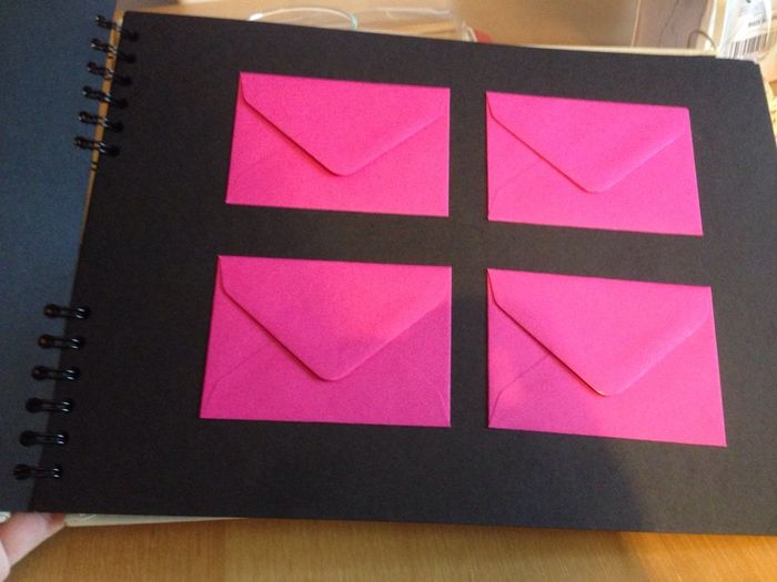 Hello les girls, Voila quelques temps que j'avais trouvé mon livre d'or a customiser : un album photo à spirales avec papier noir. Et aujourd'hui j'ai trouvé les petites cartes et enveloppes qui iront a l'intérieur ? Je collerai 4 enveloppes sur...