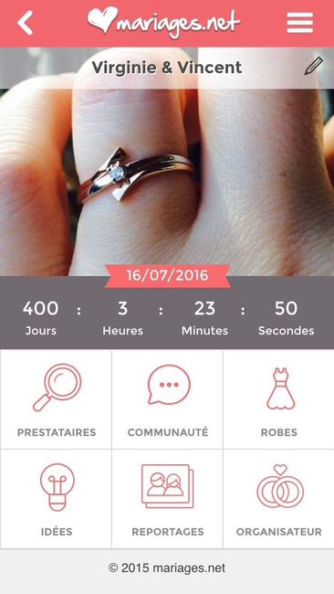 Hello la communauté des anneaux ! Allez, je me lance à l'eau aussi avec mon journal de mariée ! Ma moitié s'appelle Vincent (c'est le plus beau, c'est le plus drôle, c'est le meilleur !!) Date de la demande en mariage : 27 février 2015 (après...