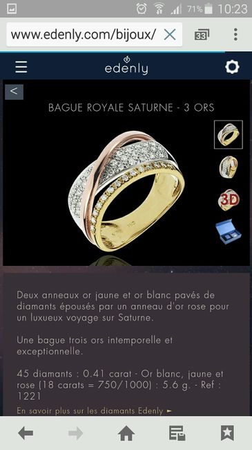 Il y a 3732 joursVa y est les filles j'ai reçu mon alliance ! !manque plus qu'à dire Oui Elle est sublime, la taille ,la gravure,la brillance. ...elle est parfaite 270 euro de différence avec histoire d'or pour la même bague et un diamant en plus!!