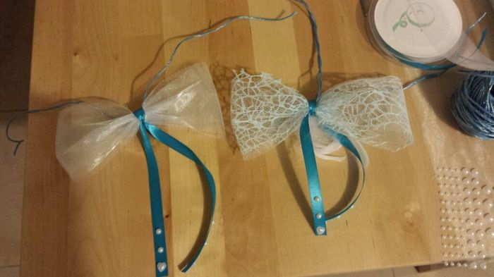 Bonsoir à toutes et à tous Voici mes noeuds de voiture (je sais que j en aurais une 100 aine à faire mais comme j'ai un reste de perle blanche ) et me suis aussi servi du chemin de table que ma mère a voulu acheter pour elle mais qui s'est trompé...