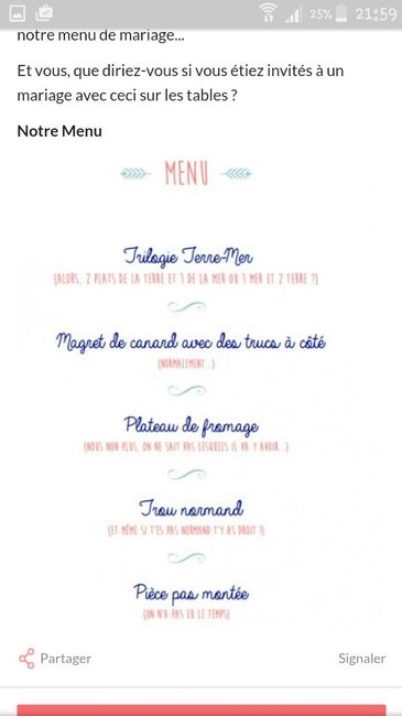 Je souhaite faire un menu rigolo je m'explique.. Je mz vois pas mettre macédoine salade de légumes carottes rappees puis patates et cochon de lait à la broche et dessert (pièce montée faite par notre témoin pâtissier et gâteaux fais par chéri...
