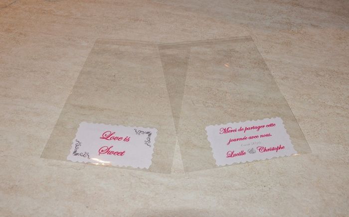 Je ne savais pas vers quoi me diriger pour mettre les bonbons du Candy Bar, puis je suis allez à Action et j'y ai trouvé des pochettes pour normalement y mettre des cartes de voeux (0.89€ les 50), une étiquette imprimé sur papier irrisée Recto Verso...