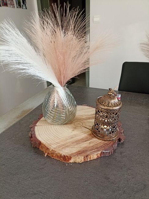 Bonjour bonjour Voilà je vais mettre des centres de tables ainsi avec les mêmes fleurs a quelques choses prêt . En revanche j ai décoré des bouteilles en forme de vases pour mettre des fleurs séchées aussi types pampa queue de lapin eucalyptus.Ma...