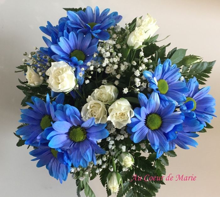 Bonjour tout le monde, Nous sortons de chez la fleuriste un peu déçus.... Notre thème couleurs est bleu roi et blanc. Nous espérions donc que mon bouquet soit des ses couleurs ainsi que nos centre de table. Mais apparemment il est vraiment difficile...