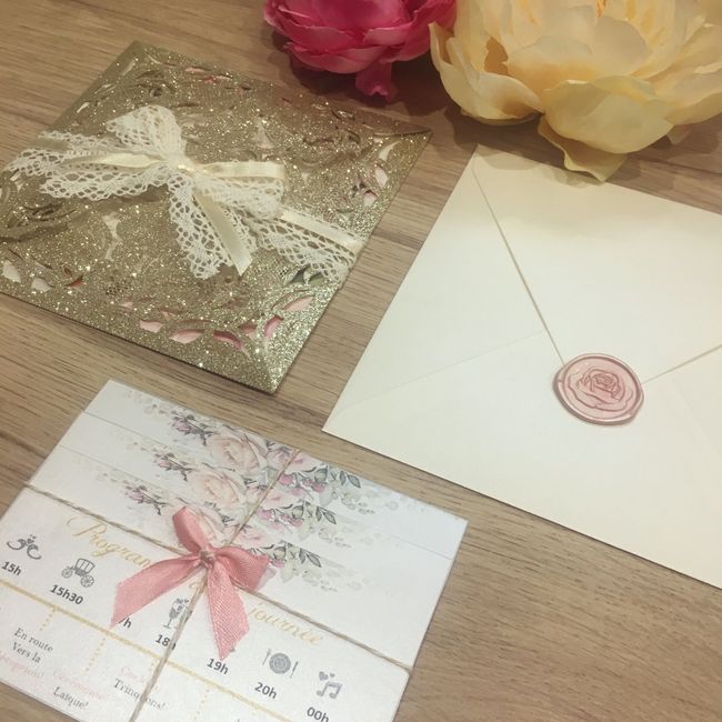 Les voici, les voilà!!! Mes jolis faire-part! Avec le cachet de cire sur l’enveloppe que je vous ai montré hier !! Il y a aussi les petites cartes DIY où je vous demandez la couleur si du noeuds j’ai donc choisi le rose! Désolée pour la qualité pas...