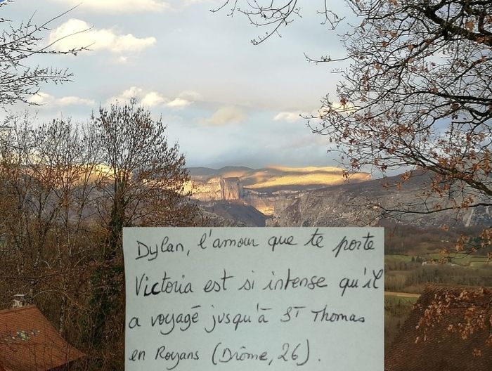 Bonjour à toutes, j'ai découvert il y a peu le 'Love Note' et j'ai besoin de vous si vous le voulais bien Pour cela, il faudrai que vous m'envoyer une photo avec sur un morceau de papier écrit " Dylan, l'amour que Victoria est si fort qu'il a voyagé...