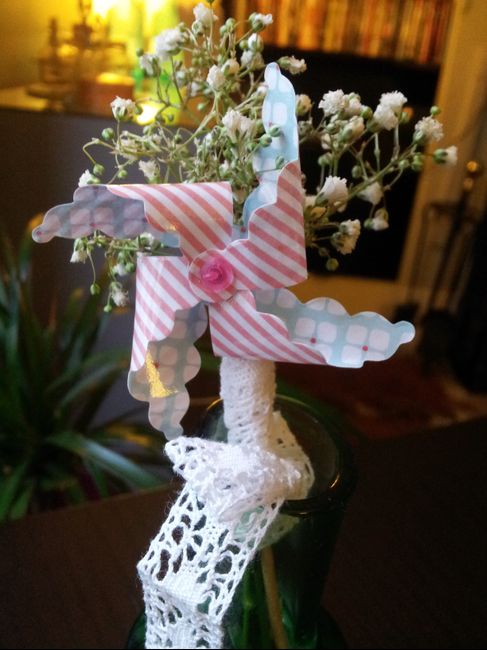 Un petit essais de boutonnière pour mon chéri, il aime bien... Es ce que ça fait Guinguette? Je me le demande? J'hésite à monter des moulins sur fil de fer et à les positionner comme des fleurs dans mon bouquet... Un bouquet assez simple juste avec...