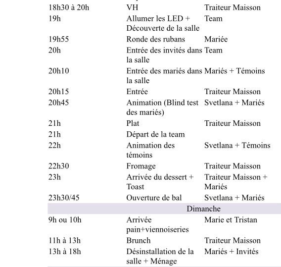 Bonjour, Est-ce que quelqu'un ici aurait un exemple de déroulement d'une journée de mariage ? (Quoi faire heure par heure, organisation des différentes prestations, rÚglements etc.) Merci ++ !