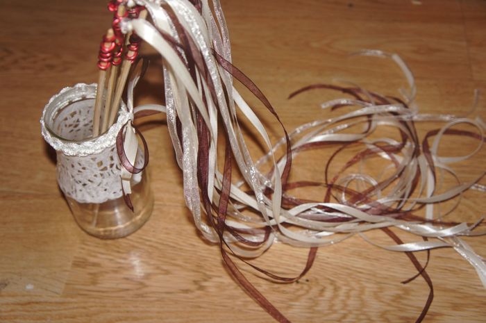 Après le jeter de riz, de pétales et les bulles, on peut maintenant agiter de joli rubans au vent et ça rend bien : Pour se faire, il faut : - des baguettes en bois (type pic à brochettes) - du ruban de 5 cm de largeur, de...