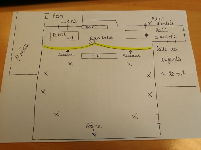 Hello les filles ! J'ai besoin de votre aide ! Notre salle n'est pas bien grande et nous devons y caser 130 personnes assises, soit environ 11 tables de 10 personnes et la table d'honneur de 20 personnes, ainsi que quelques tables pour le buffet (2-3...
