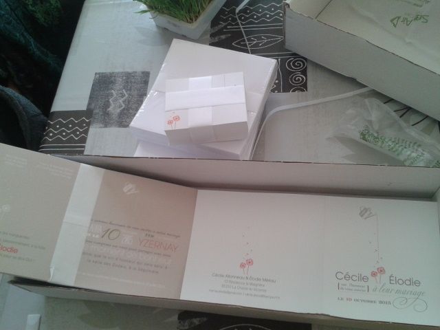 Bonjour à toutes et tous! Hier soir nous avons enfin reçu nos faire-parts! Avec mon chéri nous avons ouvert la boîte et là... Surprises! Ils sont en kit! Je me suis pris un joli fou rire en pensant que j'allais devoir les faire en plus des 1000 grues...