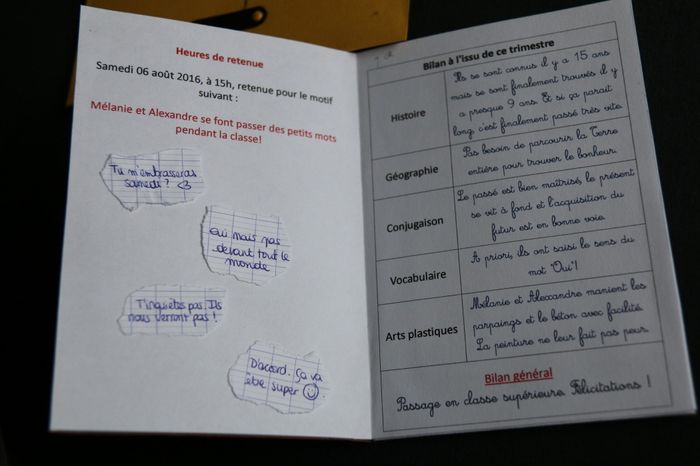 Alors voilà, étant professeur des écoles, je voulais un thème qui rappelle mon métier. J'ai réfléchi sur tout : le faire-part en cahier de liaison (Ici), les menus, les centres de table, le photobooth dans un décor d'ancienne classe (j'ai le bureau...
