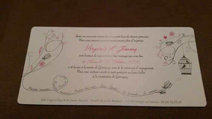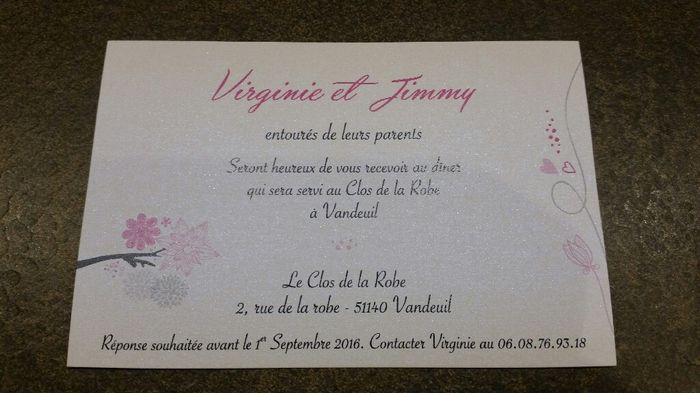 J avoue que je suis curieuse de voir vos faire parts de mariage. Le mien sauf qu a la place du ruban sur la photo je mettrais un ruban en dentelle. Il est simple mais je n ai pas de code couleur pour mon mariage alors je voulais rester dans la...