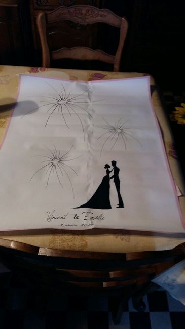 Coucou a tous alors voilà on voulait autre chose qu'un livre d'or, donc j'ai pensé à une toile de peinture vierge avec une photo au centre de nous et les gens marqueraient des petits mots ou dessin et comme elle servirait de déco dans notre maison!...