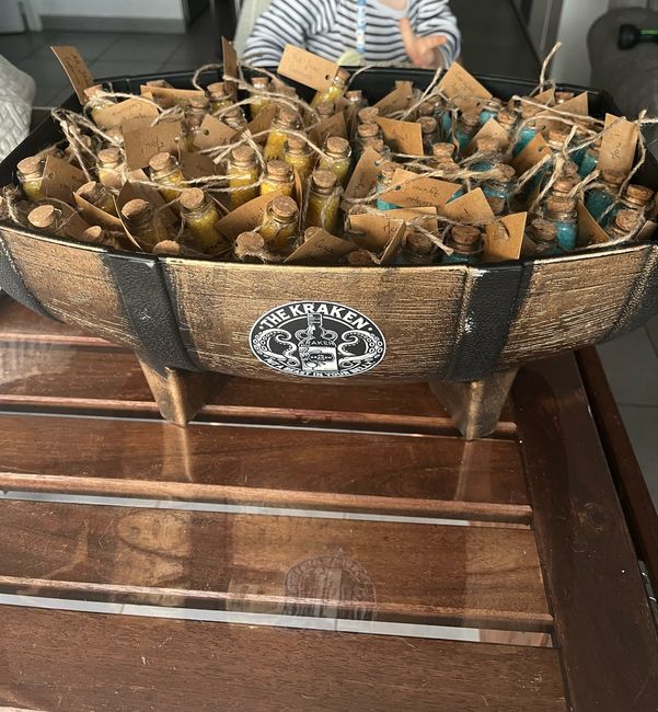 Voilà c’est enfin fini ! 2 sels aromatisés, plantés dans du sable (oui cela se voit mal haha), dans un fût de rhum ! Vous avez la réf ! Ce sera présent avec la bouteille d'or (parchemins et fils découpés), le coffre fort (urne), tête de pirates,...