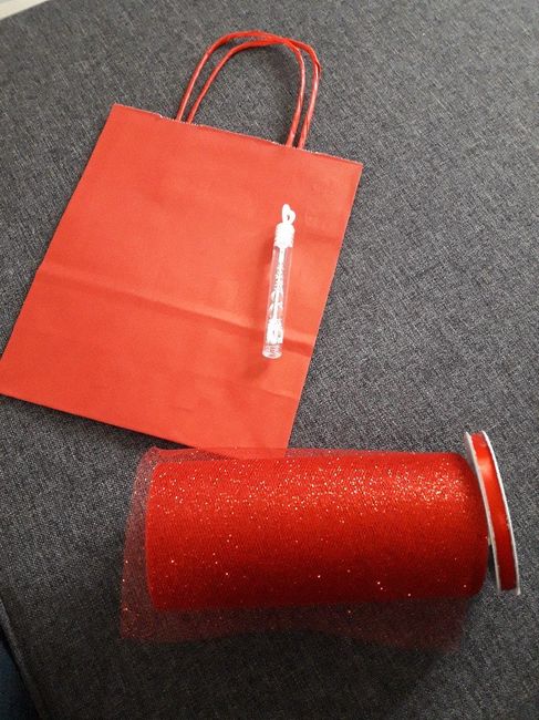 Hello à tous ! Jai recu ma commande ! Il y a le tulle rouge pailleté et le ruban en satin pour mes noeuds de voiture, mes sacs de bienvenue et je vous mets aussi en photo un contenant à bulles que je ne vous avais pas encore montré. J'étais tellement...