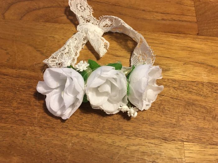 Je vous ai demandé tout à l’heure combien de fleurs et la réponse était unanime : 3. J’ai donc aussitôt fait mes 4 bracelets pour mes témoins ruban dentelle élastique, fleurs en tissu, qq strass pour le centre de chaque fleurs et mon meilleur ami le...