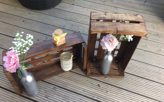 J'ai vu que certaines customisé des cagettes pour faire fonction de boîtes en bois à moindre coût car les boîtes en bois vintage coûtent cher. J'avais pris pour modele la deco faite par une fille du forum (la seconde photo) j'aime beaucoup le rendu...