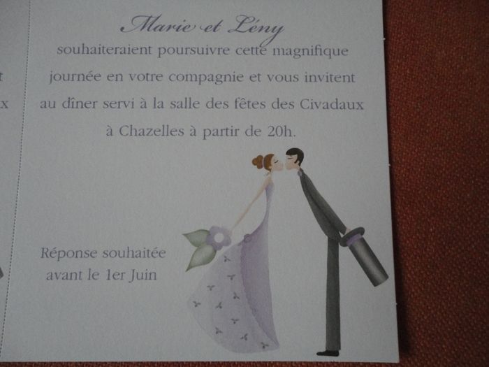 Salut à tous!! Par curisosité je me dermandais quel faire part avez vous choisi (photo)??? et quand on dit vos invités pour ceux et celles qui les ont déjà envoyés? Nous avons repéré un modele qui nous plait, simple et moderne...