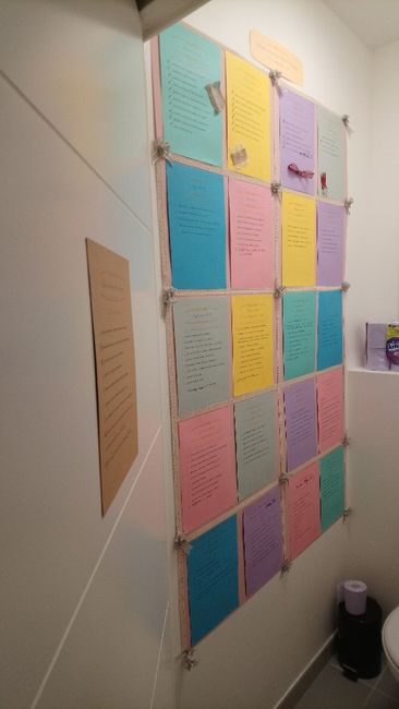 Je m'aperçois que je poste pas mal de chose mais que j'ai oublié peut être la principale : mon retroplanning géant ! Oui oui il prend un mur entier des toilettes vous avez bien vu ! Et sur l'autre mur c'est un calendrier des semaines à venir pour...