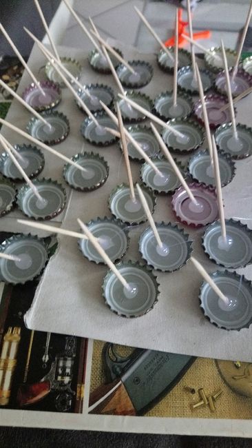 Hello à tous J'ai commencé mes capsules '' porte nom''. J'ai collé des cures dents pour ne pas m' en mettre plein les doigts, j'ai peint en bleu/vert (je pensais que c'était du bleu pastel 🙄) et rose, je ferai une seconde couche puis un peu de gris...