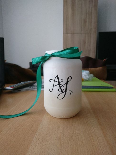Je dis mignonnettes mais c'est peut être pas le mot exact ^^... Mes contenants en verre viennent d'action. J'ai réalisé moi même l'étiquette qui est dessus et qui sera raccord avec mon faire part (car il y aura aussi les fougères que l'on y voit) ....