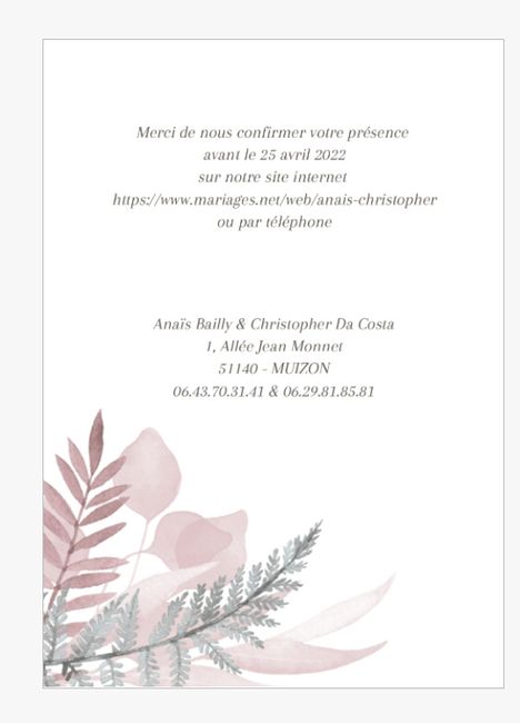 Bonsoir à tous et toutes, J'ai reçu notre premier visuel pour notre faire-part, qu'en pensez-vous ? Il sera imprimé sur du papier ensemencé, le rendu fera plus "rustique" et moins lisse, le fond sera sans doute moins blanc que sur la simulation...
