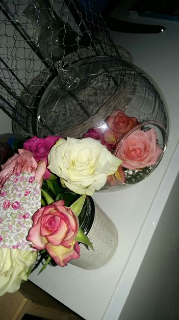 J'ai pas pu résister ! Un bouquet de roses acheté cette semaine chez Lecl** , un ancien pot de confiture, une fin de pelote de laine ( enfin du coton), une chute de tissu liberty ( souvenir du temps où j'avais le temps de coudre...) .....une dizaine...
