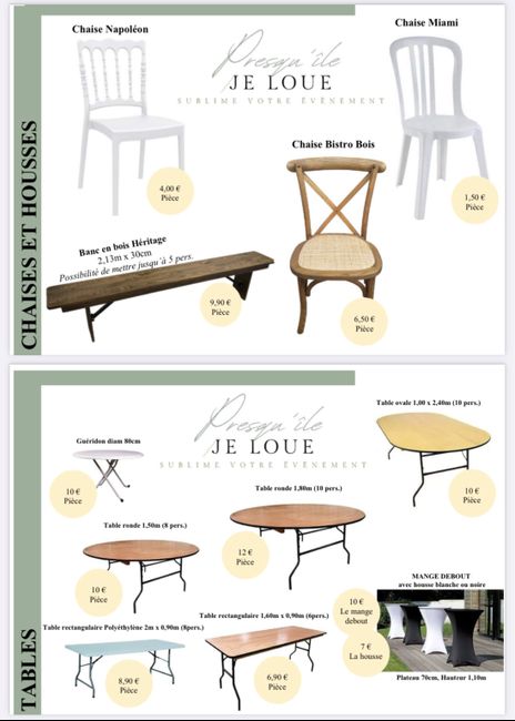 Bonjour. Est ce que quelqu'un connais les prix de chaises ainsi que de tables.rondes svp? Je voudrais avoir une idée svp.Près de chez moi jai un maine reception.si quelqi'un connais.