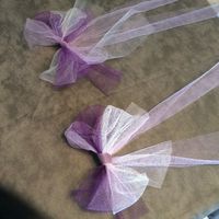 Il y a 3998 joursJ'avais commencé à faire des essais de nœuds avec du Tulle pour les voitures, trois couleurs, violet, parme et blanc. Lors des essais, le Tulle était fin. Vu que j'en avais pas assez, j'en ai acheté ailleurs mais du coup le rendu n'est pas le même...