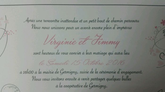 Cc tout le monde j'ai mis hier une photo de mes faire parts pour avoir une aide pr les éventuelles fautes. Mais apparemment on voyait rien. J'espère avoir plus de succès aujourd'hui...
