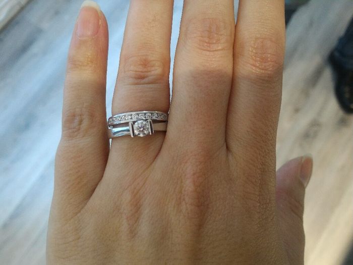 Coucou les filles! Aujourd'hui essayage d'alliances. J'hésite entre ces 2 modèles. D'après vous laquelle se marie le mieux avec ma bague de fiançailles? Merci d'avance pour votre avis!