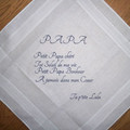Il y a 3880 joursVoici mes texte choisi pour les mouchoirs que j offrirait à mon papa , ma maman , mon petit frère et un pour mon chéri. Le texte de mon papa est modifié : Papa chéri, toi le soleil de ma vie. Papa bonheur à jamais dans mon coeur. Le texte de chéri...