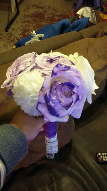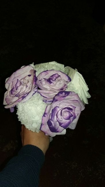 Bonjour bonjour les filles !! LE voila ! Enfin MON bouquet a moi totallement unique !N'ayant pas de peinture sous les mains j'ai laissé les roses blanches mais le jour j elles seront violettes/parme ! Mon futur vient de voir mon bouquet dans mes...
