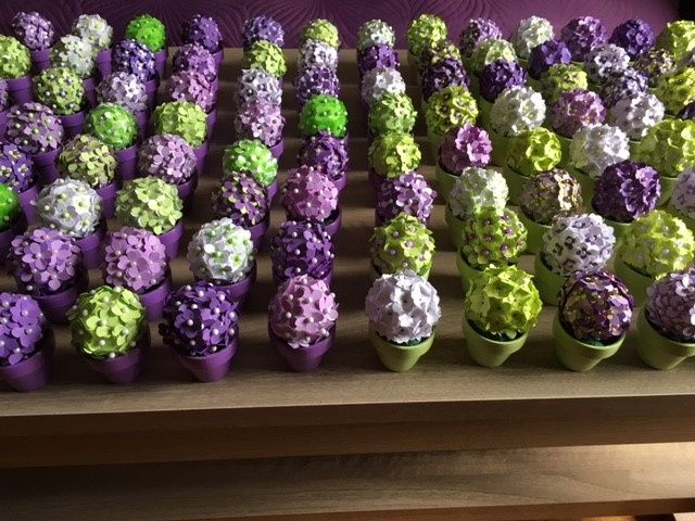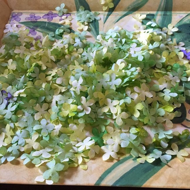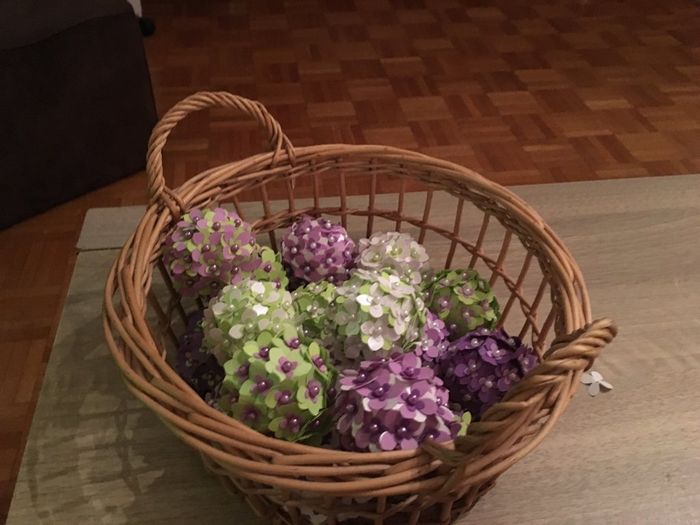 Voilà mes créations en cours : des boules d'hortensia pour mes portes noms et le début de la déco de notre livre d'or