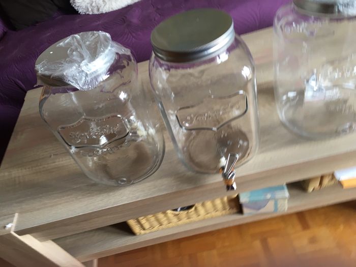 Hello les filles, j'espère que vous allez bien et que vous avancez bien dans vos préparatifs. J'ai recu 2 colis: 3 fontaines à boissons achetées sur le site Paris prix au prix de 20 euros l'une, contenance 8 litres. Un panneau de bois bienvenue...