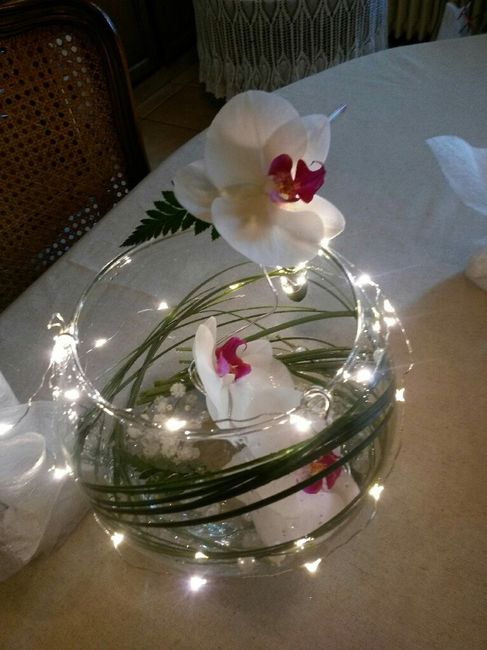 Hello, Petit partage du jour, voici l'essai pour mes centres de tables. Alors la fleuriste ma pris plusieurs photos, un juste ac les fleurs, l'autre ac un peu de feuillage et le 3e ac des petites pierre+chauffe plat. Fleur 2e essai 3e essai Alors...