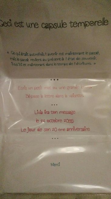 comme je l'ai indiqué dans un autre post, je ne suis pas du tout fan du livre d'or. Parcontre, je suis tombée sur l'idée de la capsule temporelle. Et là pour le coup, l'idée m'emballe. l'idee de mettre des choses à l'intérieur (comme une bouteille de...