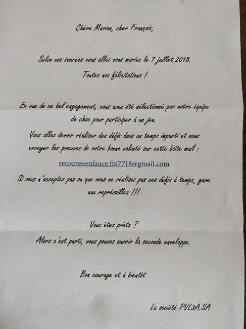 Il y a 3181 joursAprès avoir eu une surprise de tous nos amis pour les J-365, je m'attendais à ce qu'il se passe quelque chose pour le 7 du mois suivant donc aujourd'hui... Et bien pas manqué, je vais à la boîte aux lettres ce matin (chose que je fais ultra rarement)...